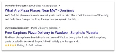 As you can see, the review markup gives Sarpino’s Pizzeria an extra advantage against Domino’s, which ranks above it, simply by providing users reliable insight into how other customers view them. The added color to the result also draws attention to it as the yellow stands out against the common blues and greys of other results.