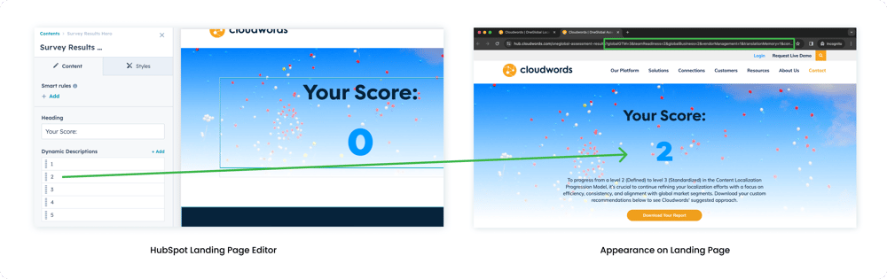 Cloudwords’ sales and marketing teams were already using HubSpot as its CRM platform, and its website was built on HubSpot’s CMS Hub. To create a more cohesive brand experience and eliminate the need to manually update CRM data and email results to users, Blue Frog proposed building a custom survey and landing page directly in HubSpot. This would allow the Blue Frog team to connect the survey directly to the CRM and maintain consistent branding and design throughout the user experience.